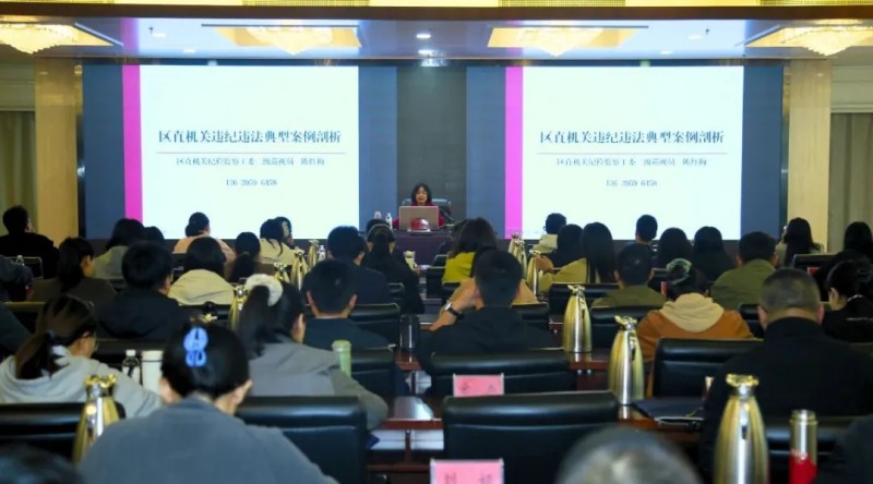 区直机关纪检监察工委陈红梅剖析区直机关违纪违法典型案例,开展警示教育。