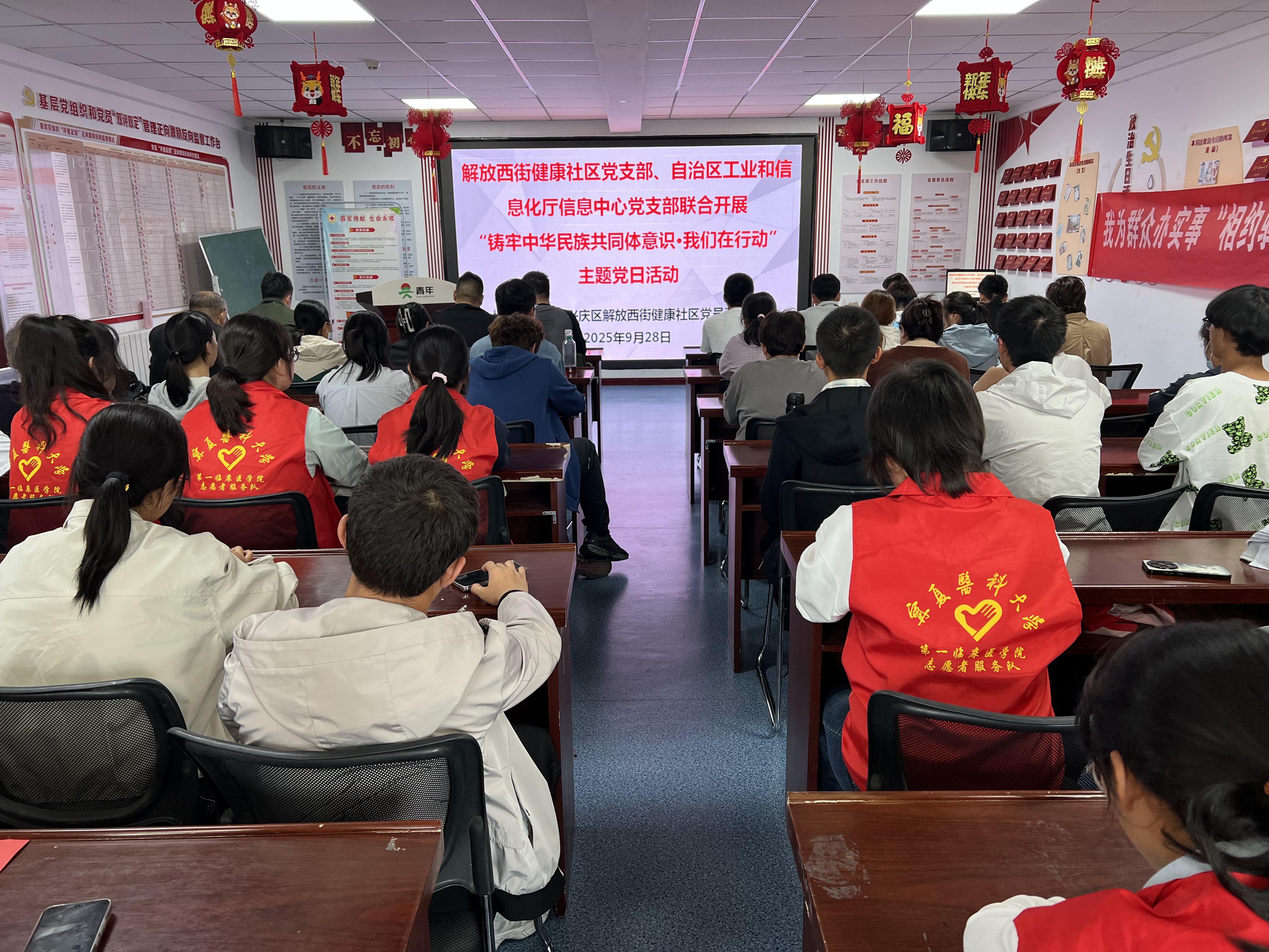 为深入贯彻落实习近平总书记关于加强和改进民族工作的重要思想,结合自治区第42个民族团结进步月活动要求,近日,自治区工业和信息化厅信息中心党支部与银川市兴庆区健康社区党委,联合开展“铸牢中华民族共同体意识·我们在行动”主题党日活动,通过“理论学习+志愿服务+文化联谊”的形式,将民族团结理念融入实际行动,持续推动铸牢中华民族共同体意识走深走实。