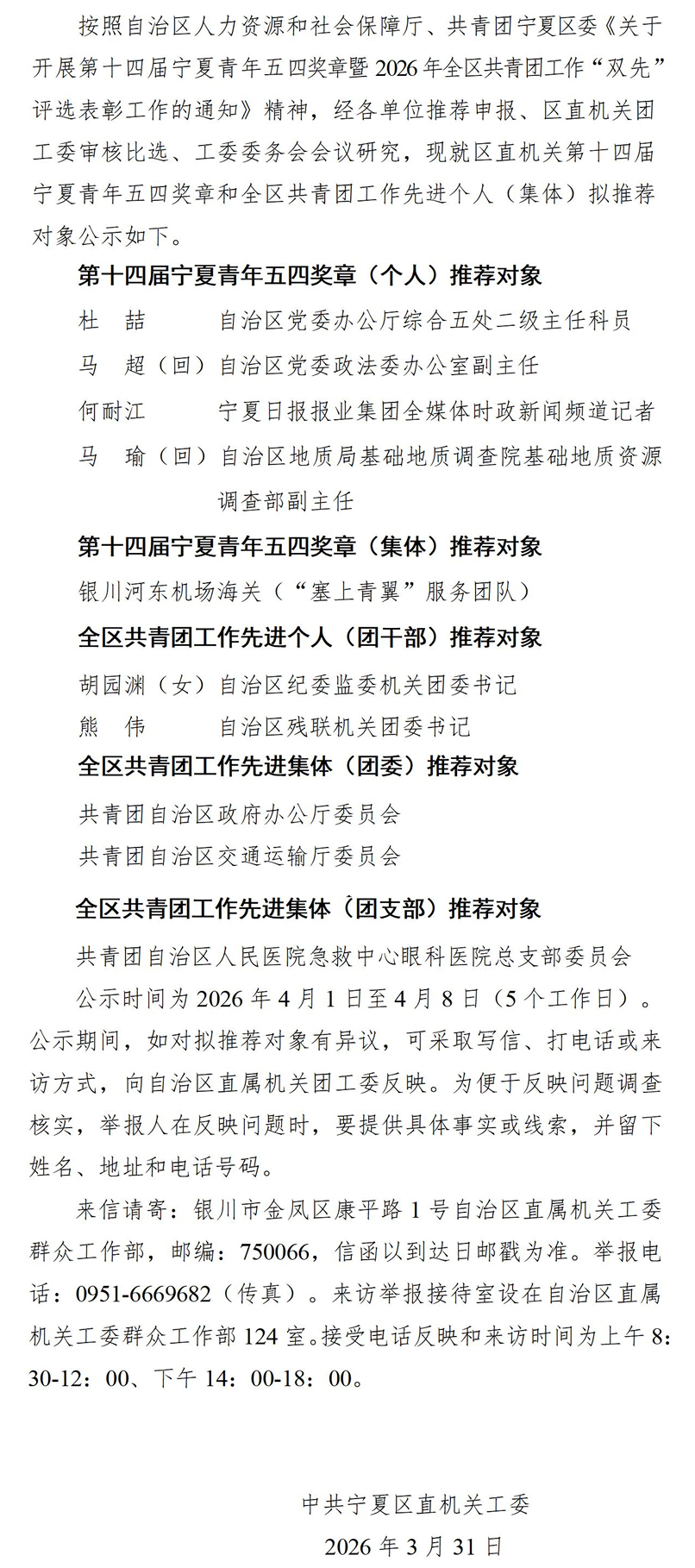 关于区直机关第十四届宁夏青年五四奖章和全区共青团工作先进个人(集体)拟推荐对象的公示