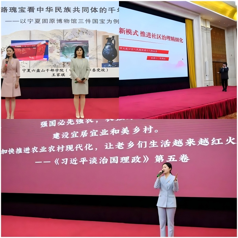 围绕铸牢中华民族共同体意识、基层治理、乡村全面振兴3个专题,邀请宁夏六盘山干部学院、固原市委党校教师王家琪、冯静,石嘴山市大武口区人民路街道工人街社区党委书记倪艳红,固原市泾源县委党校教师、泾源县大湾乡副乡长(挂职)明雪,分别作《从丝路瑰宝看中华民族共同体的千年交融——以宁夏固原博物馆三件国宝为例》《基层“七微”新模式 推进社区治理精细化》《牢记嘱托勤奋斗 杨岭嬗变换新颜》案例宣讲,通过身边典型案例剖析、可见可感的鲜活故事分享,生动阐释学习贯彻的实践路径和转化成果,以案促学、以讲促效。