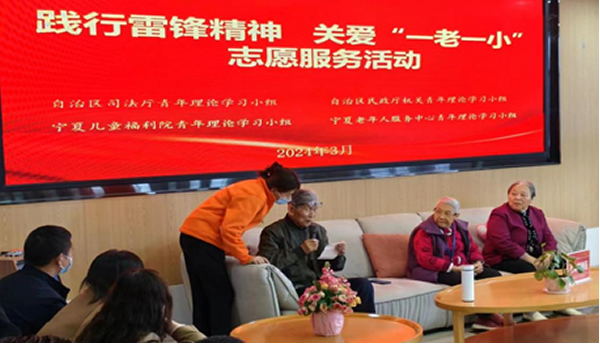 服务“一老一小”,奉献爱心。4个青年理论学习小组结合多单位、多环节、多人员的实际,提前筹划、实地了解,反复修改完善活动实施方案,避免打扰老年人休息、影响儿童福利院教学和养护等工作。青年干部为老年人赠送按摩棒,为儿童福利院赠送益智玩具,走进宁夏老年人服务中心与老年人促膝围坐、亲切交谈,详细了解老人身体和生活状况,倾听老人生活故事和经历,在互动交流中给老年人送去心灵慰藉,使老年人感受到青年人的爱心和社会大家庭的温暖。