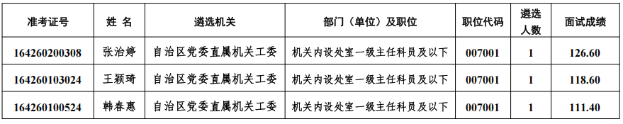 根据《宁夏回族自治区2026年区直机关公开遴选公务员公告》有关要求,经2026年4月20日面试,现将自治区党委直属机关工委2026年公开遴选公务员面试成绩公告如下(面试成绩保留小数点后两位):